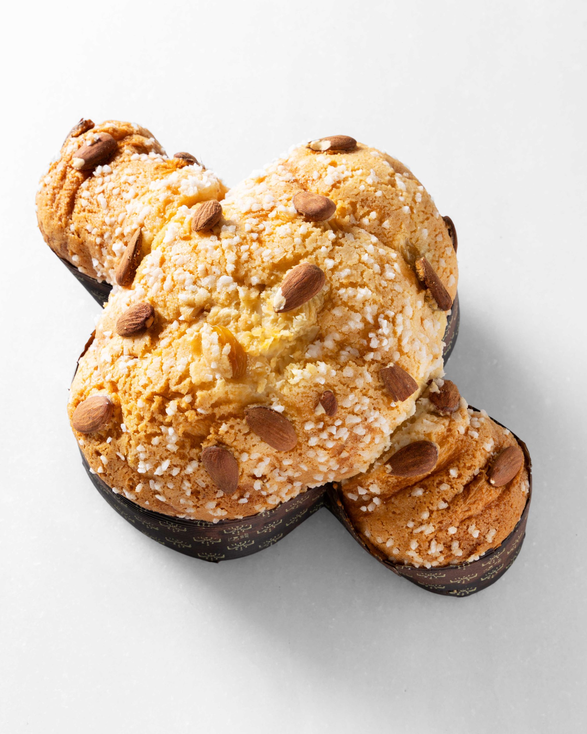Masa de panettone con dos amasados y 48 h de fermentación, con naranja confitada, limón confitado, pasas y aroma de vainilla, miel y cítricos. Recubierta de almendras.